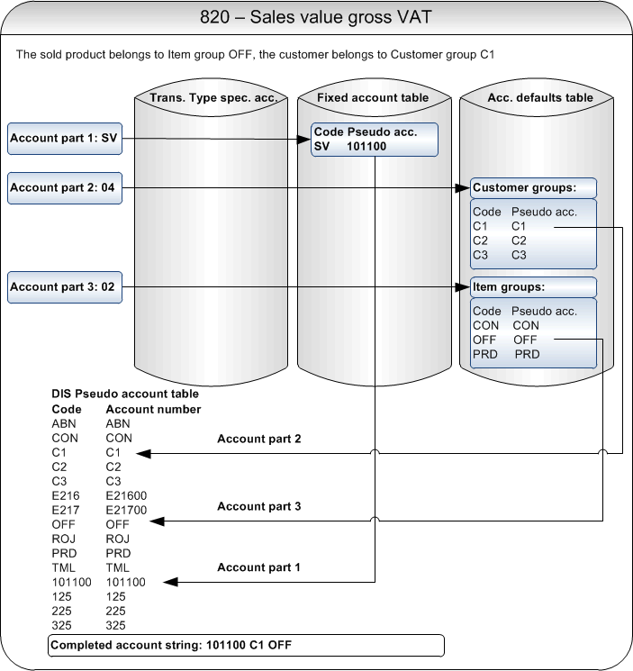 To exemplify the procedure, you will define the accounting of transaction type 820 – Sales value Gross VAT. This transaction type is created when you invoice a VAT based item on a normal invoice (not cash sales).