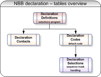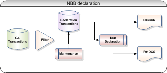 This section describes the steps performed prior to loading an NBB declaration. It allows you to set up the tables/files needed to filter the transactions for each declaration. It loads the file with the transactions of IBS Enterprise for each declaration, finally submitted to the NBB.