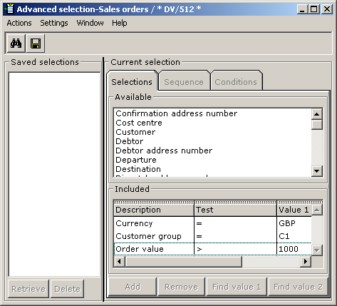 - Selection is by Currency (GBP), Customer group (C1) and Order value (>1000)