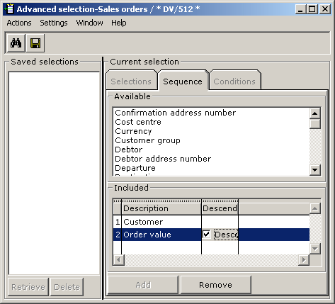 For this example you will create an advanced selection in the Sales order browser where you want to be able to view the following end result: All customers within a specific customer group that have an order value greater than a certain amount in a certain currency.