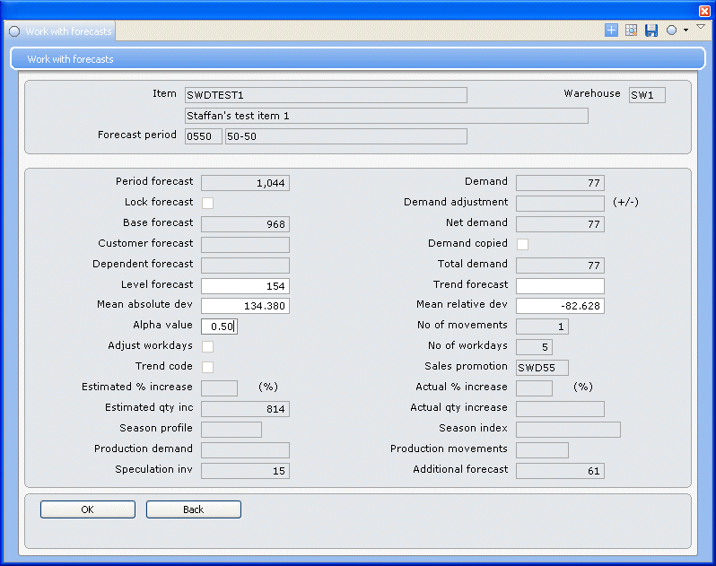 The forecast can be changed on item/warehouse level. If a season profile is attached to an item/warehouse the season profile will be used to calculate period values. The period forecast is updated even if a manual forecast exists in one or more periods, but the manual forecast value is still used when total forecast is calculated.