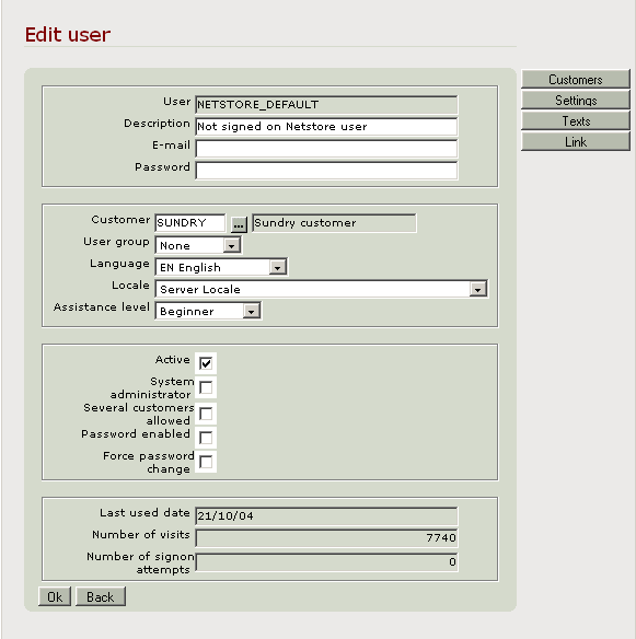 Miscellaneous customers that seldom place orders may register their orders as sundry users instead of having to sign on with a user account. All users who choose not to sign on during the order placement will be registered as sundry users for the defined sundry customer number.