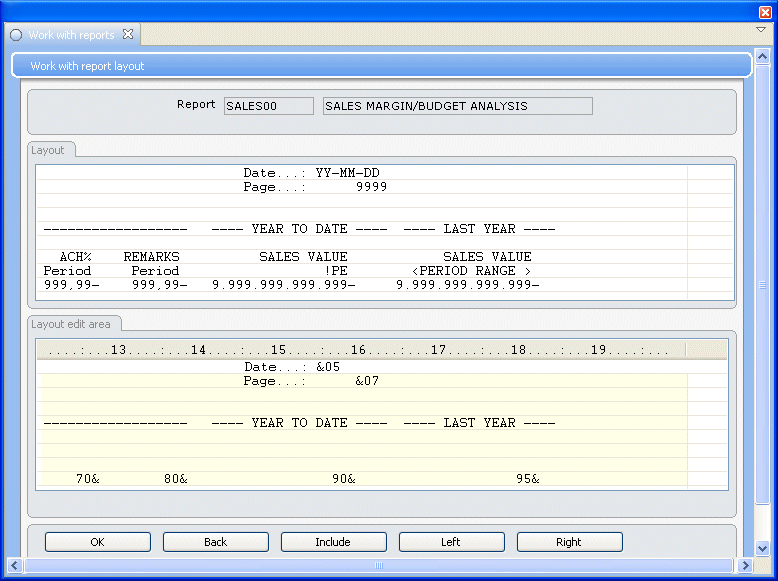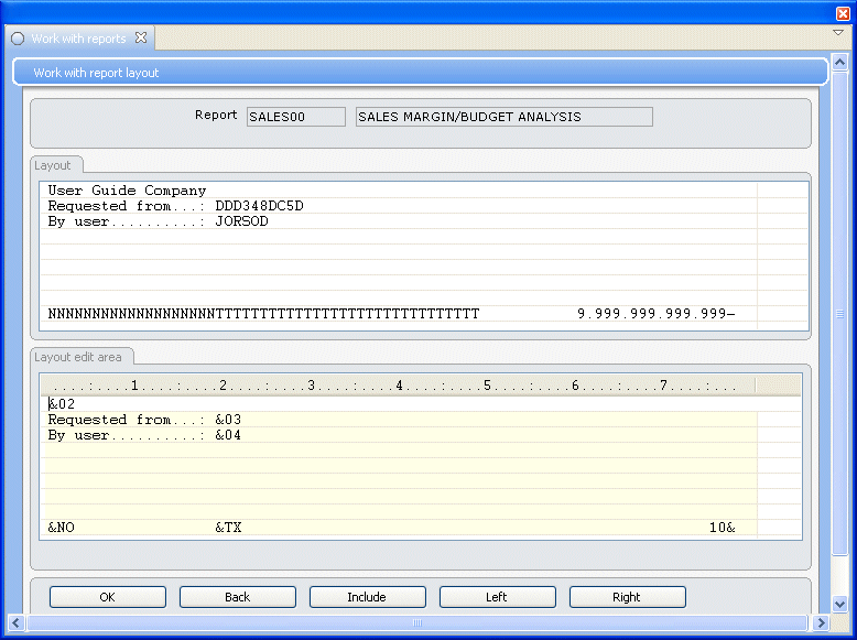 - You access Work with report layout. When you first access this panel for a new report, it is empty. The panel is divided into two parts. In the upper part of the panel, you will see the result of what you define in the bottom part of the panel. In the bottom part of the panel (the layout edit area), you have nine lines at your disposal. On the first eight lines, you can enter either text of your own, or layout codes.