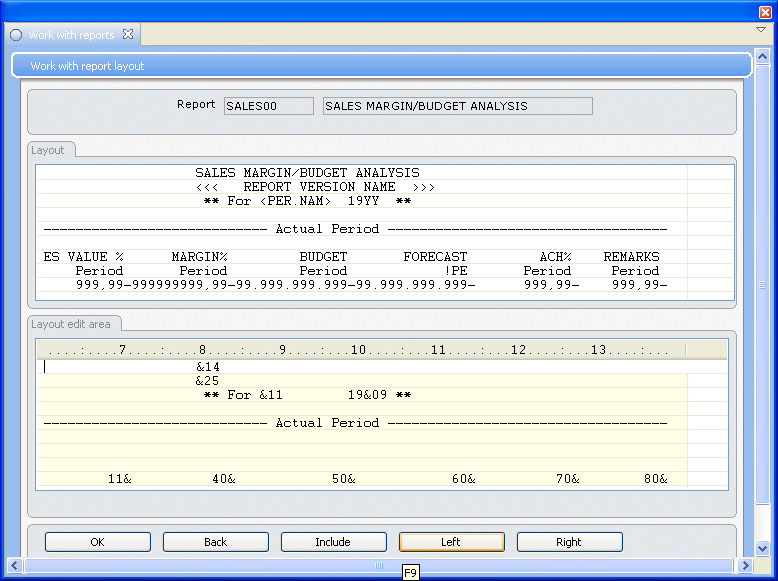 If you want to include the key field texts on a report, enter &TX on the ninth line on report layout panel. When the report is printed, the key field texts, corresponding to the keys defined in the report version, are retrieved and shown on the printout.