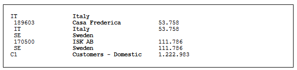 As you see, the sum is shown for each customer (Casa Frederica and ISK AB), for each country (Italy and Sweden) and for each (in this example there is only one) customer group (Customers – Domestic).